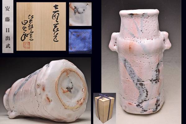 - 安藤日出武 ★ 絵志野耳付花入 ★ 共箱共布栞 ★ 花器 ★ 巨匠 ★ 検 古志野