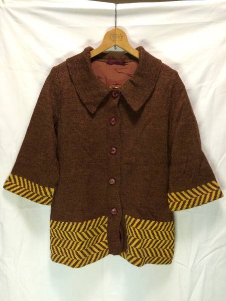 > 古着 ビンテージ ハンドメイド 70s ニット カーディガン コート ブラウン 茶 ハンドニット 手作り ジャケット ツートンカラー 昭和レトロ