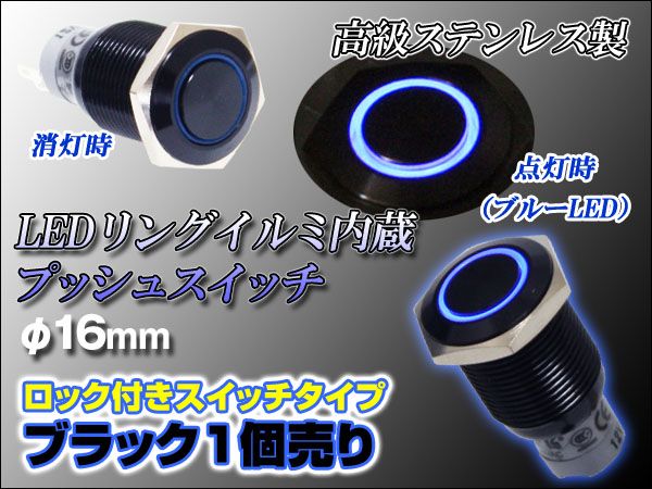 - LEDリングイルミ プッシュスイッチ 16mm ブラックボディ/ブルー