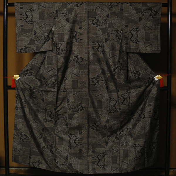 - 正絹 九マルキ 片ス 寸法小さめ 御所車柄 大島紬 -袷-