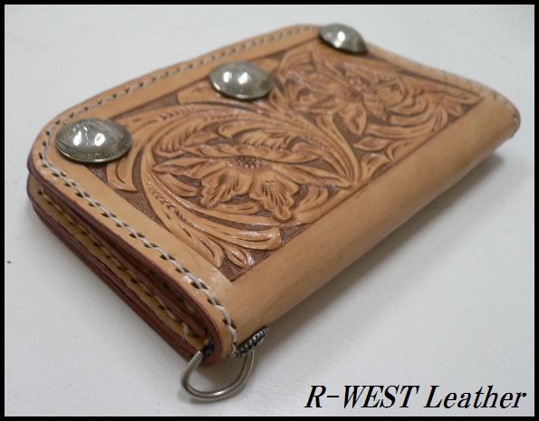 - 牛革カービング アラベスク リアルコイン コンチョ3個付レザーウォレット/ミドルサイズ