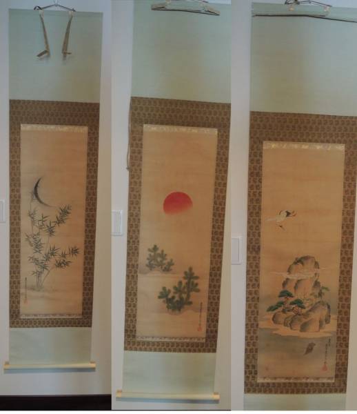 土佐光孚 肉筆 竹、松、鶴亀 三幅対 絹本着色 掛軸 共箱