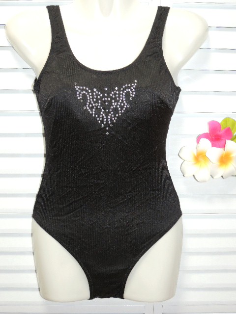 - Nikki 日本製 ワンピース水着 9号/M ブラック×ストーン飾り ストライプ生地