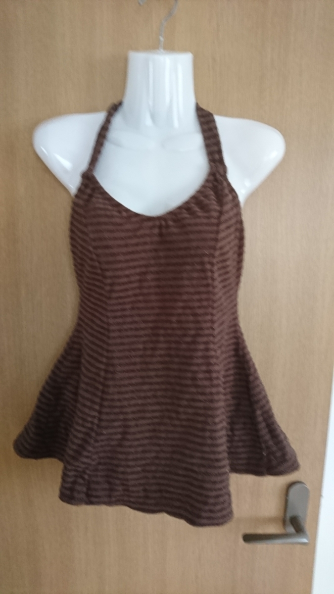 - ☆大きいサイズ☆茶系のスカート付きワンピース水着☆サイズ13L☆総裏地あり☆日本製☆控えめなラメ入り☆ボーダー風☆
