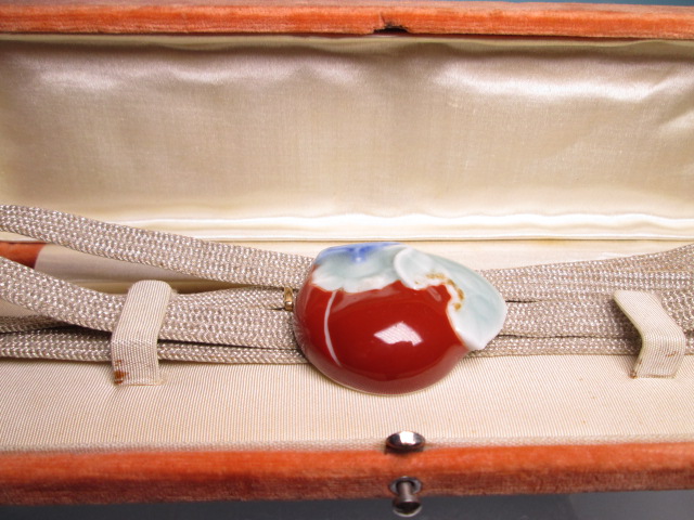- ☆アンティーク・K18 十二代 酒井田柿右衛門造 色絵 柿の帯留め ケース付