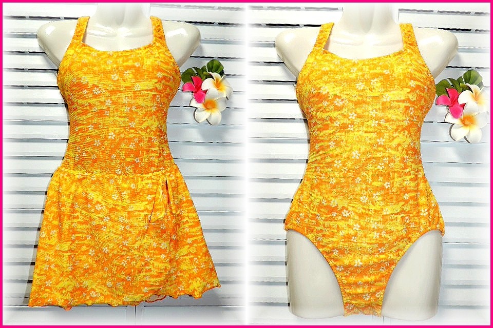 - ブラックシャーク 裏地付き ワンピース水着 パレオ風スカートセット 11号/L オレンジ~イエロー杢×小花柄