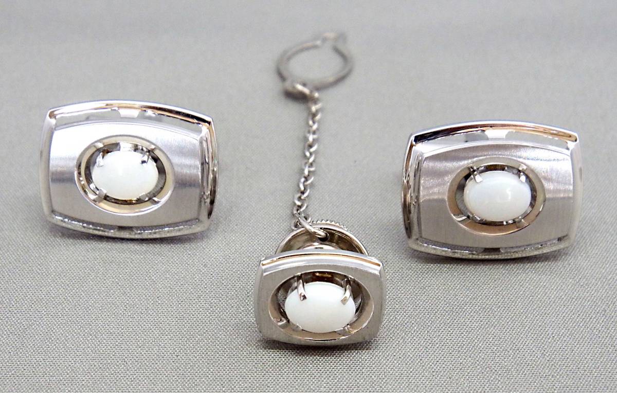 - EU-9398■BORROMEO カフス&タイタックセット オパール シルバーカラー 中古
