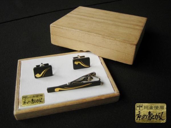 - 肥後象嵌 ネクタイピン カフスボタン セット 純金象嵌 伝統工芸 木箱 アンティーク レトロ 昭和