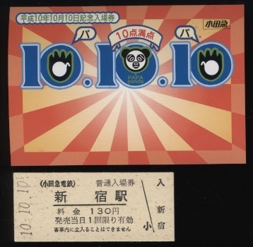 - 小田急 平成10年10月10日 新宿駅記念入場券 10点満点パパ