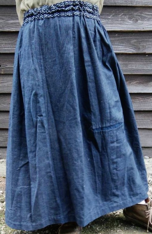 - 古布木綿藍染縦縞スカート ウエスト部分ゆきんこ絣 ポケット1個