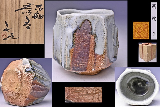 > 西端正 ★ 丹波 灰釉 面取 ぐい呑 ★ 共箱 共布 栞 ★ 酒器 ★ 力強く景色豊かな逸品 ★検 西端大備 西端末晴 六古窯