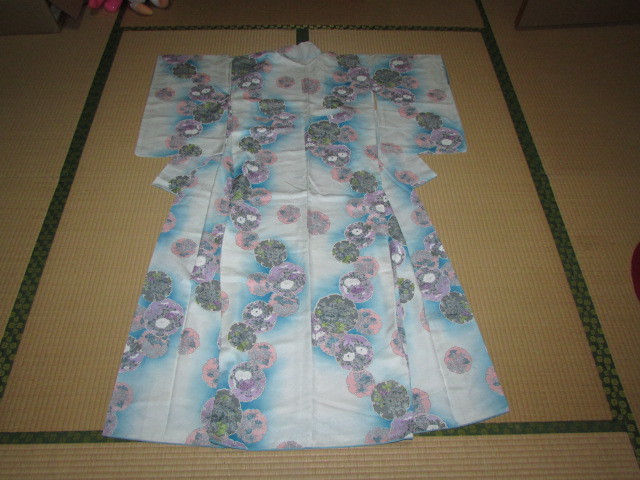 - 1000円値引き(着物屋・蔵出し)(古布・雪輪に薔薇・菊・南天模様着物)貴重珍品