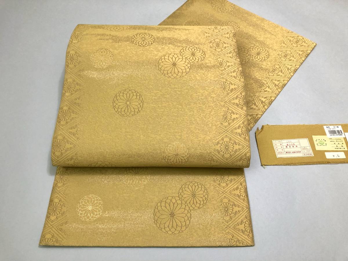 - O09 未使用 袋帯 本場筑前 博多帯 協和織 謹製 紋袋帯 絹100%金属糸使用 金糸ラメ 麦藁色地 紹巴 君子菊文 長4m28cm
