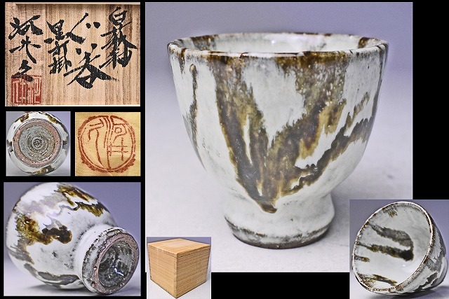 - 河井久 ★ 白萩釉黒打掛ぐい呑 ★ 共箱共布 ★ 師:河井寛次郎 河井武一 ★ 民芸陶 ★ 京都 ★ 見事な釉景の上手作 ★ 酒器 ★