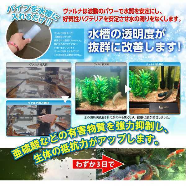 錦鯉の品評会に参加されてる方が池に入れたら水質が改善され水が清んできた、らんちゅうやアロワナの飼育者からはヴァルナを入れて2日後に透明度が増し驚いた、海水魚の飼育者からは臆病で隠れてばかりいた魚が活発になったなどたくさんの報告が届いています。
