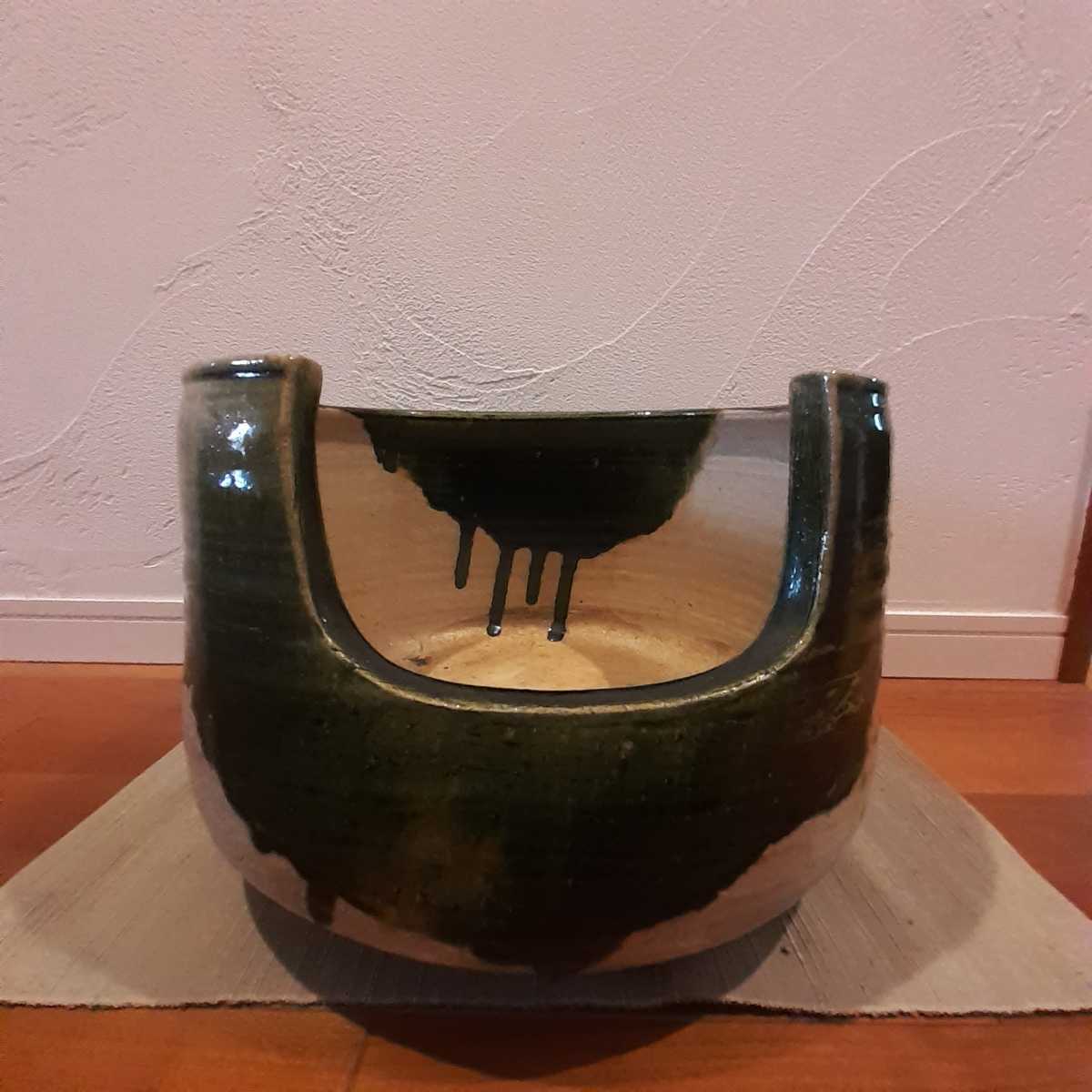 - 時代 織部 土風炉 風炉 銘あり 高さ約23.5cm 縦横 約32cm×33cm