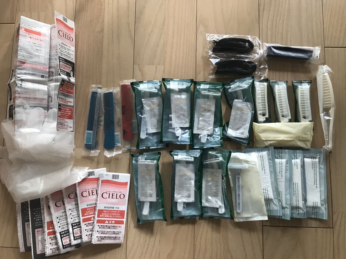 - お手入れ品透明ビニル手袋&折畳みヘアブラシ&コーム&シェーバー&スポンジ