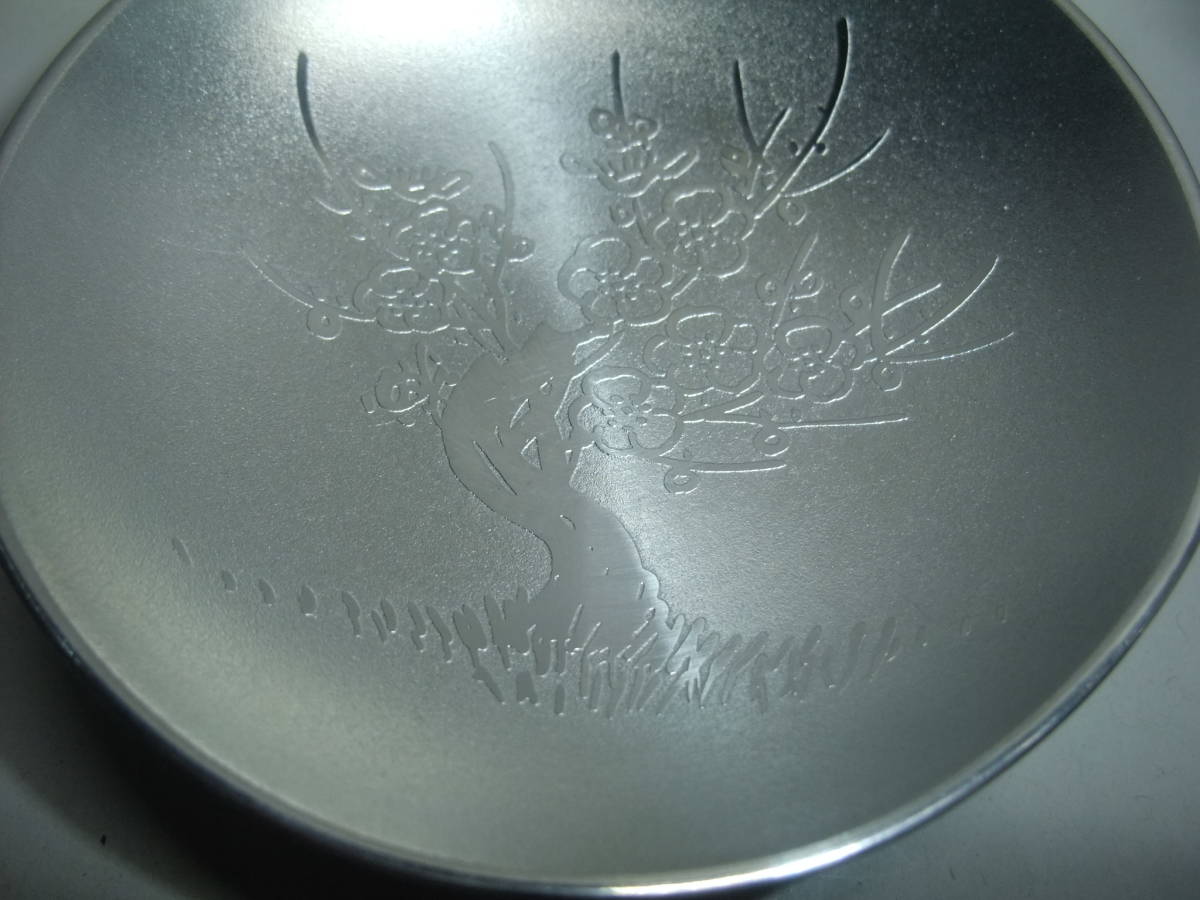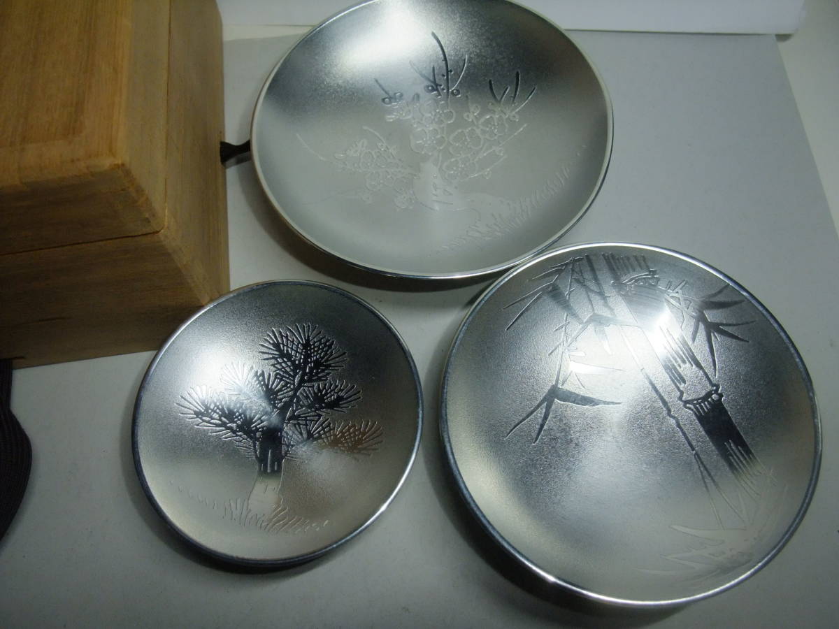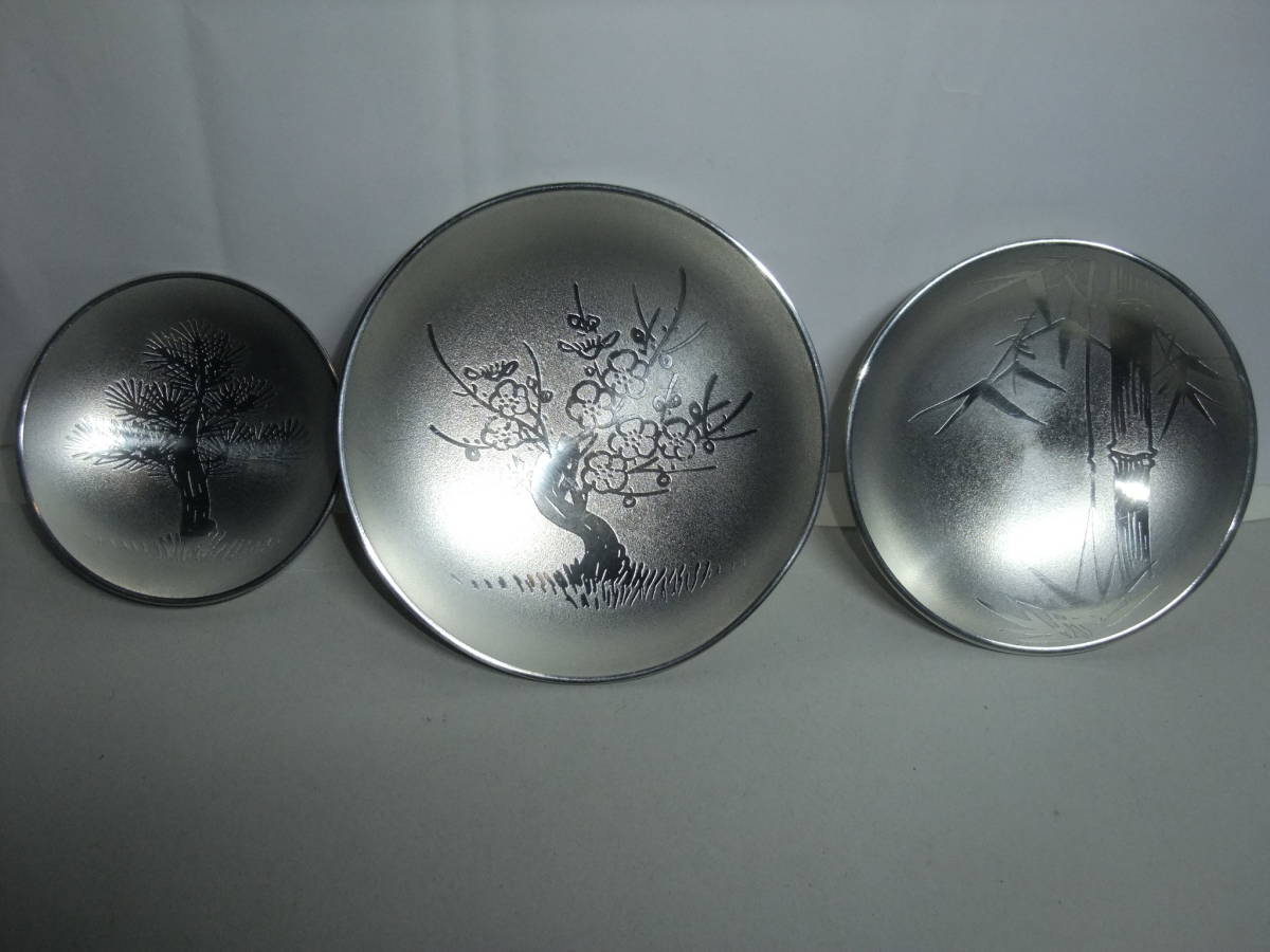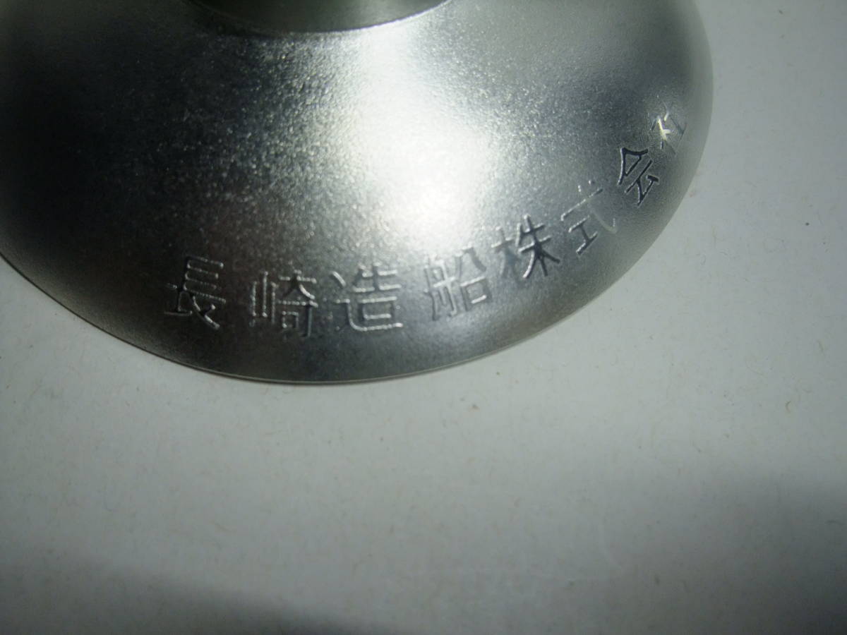 - 錫製 長崎造船株式会社 十年勤続記念 昭和五十七年六月一日と表示のある松竹梅柄 3段盃(桐箱入り)