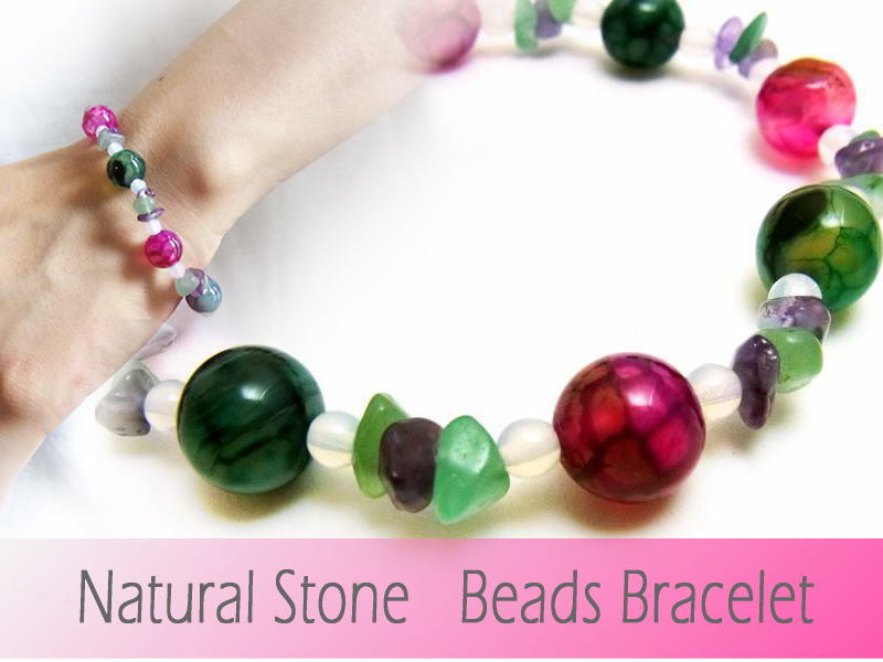 > ウロコのような編み目模様のアゲート使用♪ 手作り メノウ&アメジスト・ヒスイ サザレミックス 天然石ブレスレット 数珠 18㎝