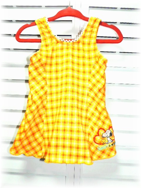 - スヌーピー刺繍 ワンピース水着 イエロー×オレンジチェック ベビー90cm