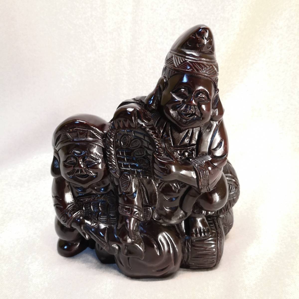 > 【送料無料】◆木彫り「恵比寿 大黒天」像 細密 彫刻 全高 約24㎝◆開運/七福神/商売繁盛/小判/大判/骨董品/アンティーク/置物/仏教美術