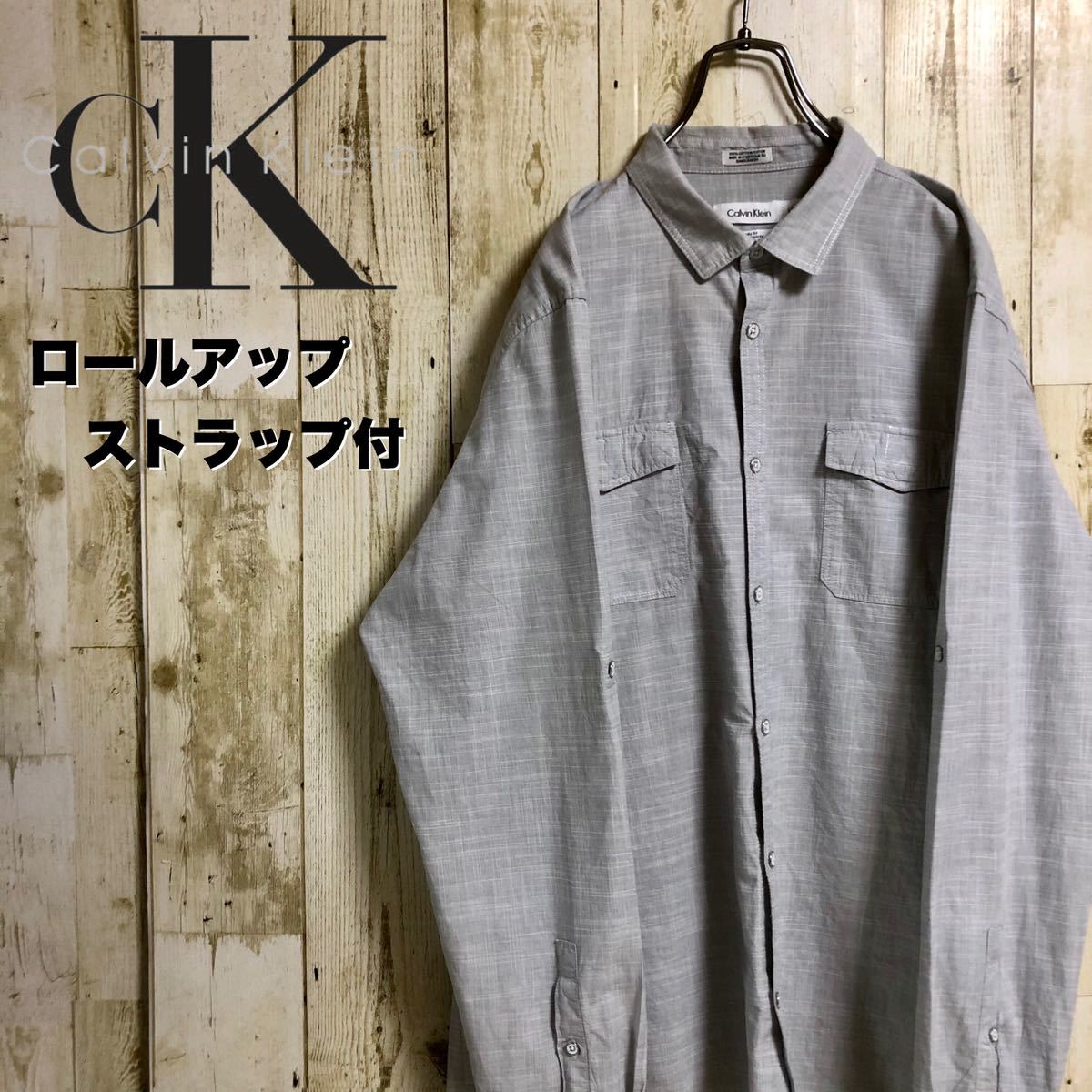 > Calvin Klein カルバンクライン ロールアップボタン 袖まくりストラップ ロゴボタン裾ネームタグ 長袖シャツ ライトグレー L 古着