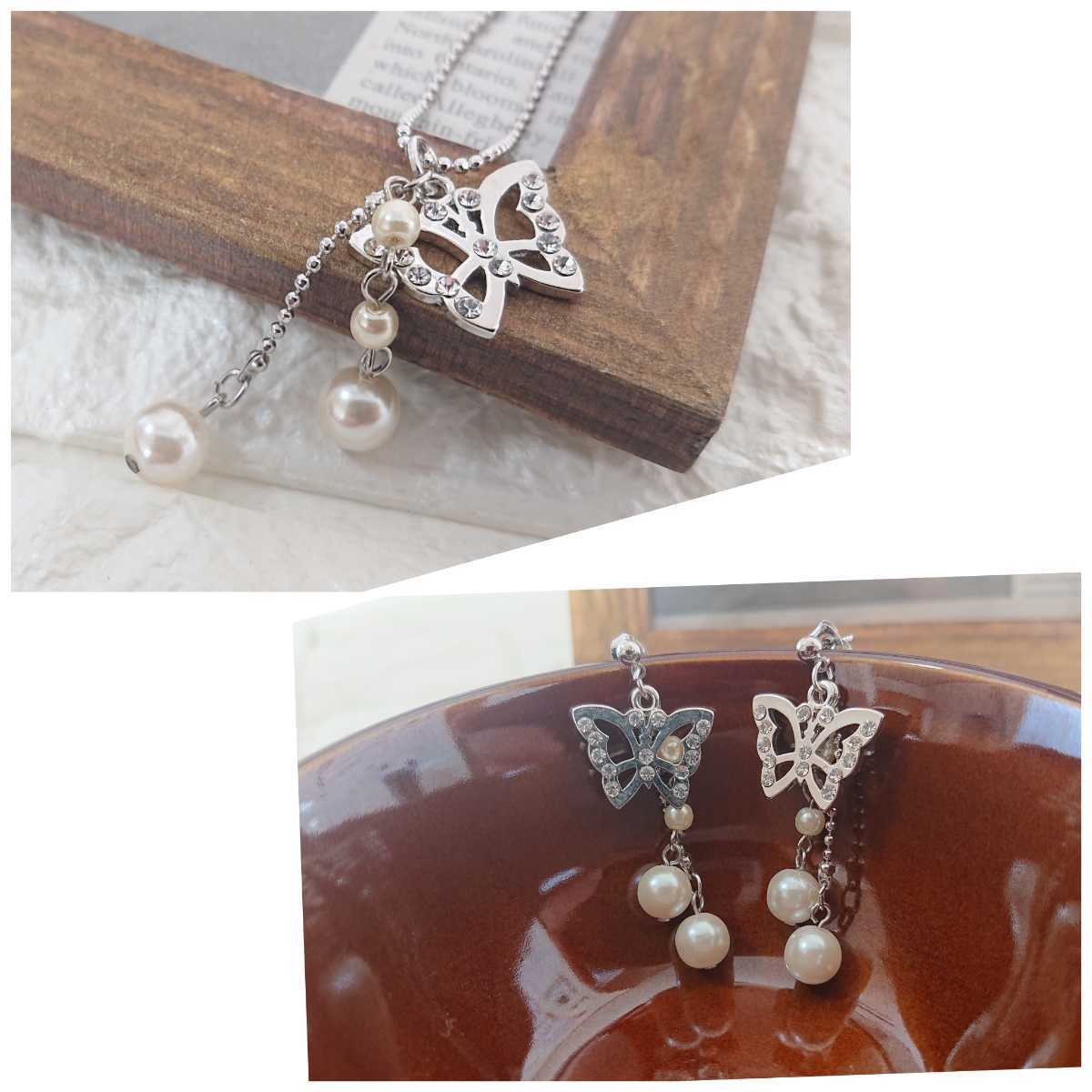 > □清楚な印象□揺れる蝶々×クリアラインストーン&パールビーズ□シルバーカラーのネックレス&ピアスset□