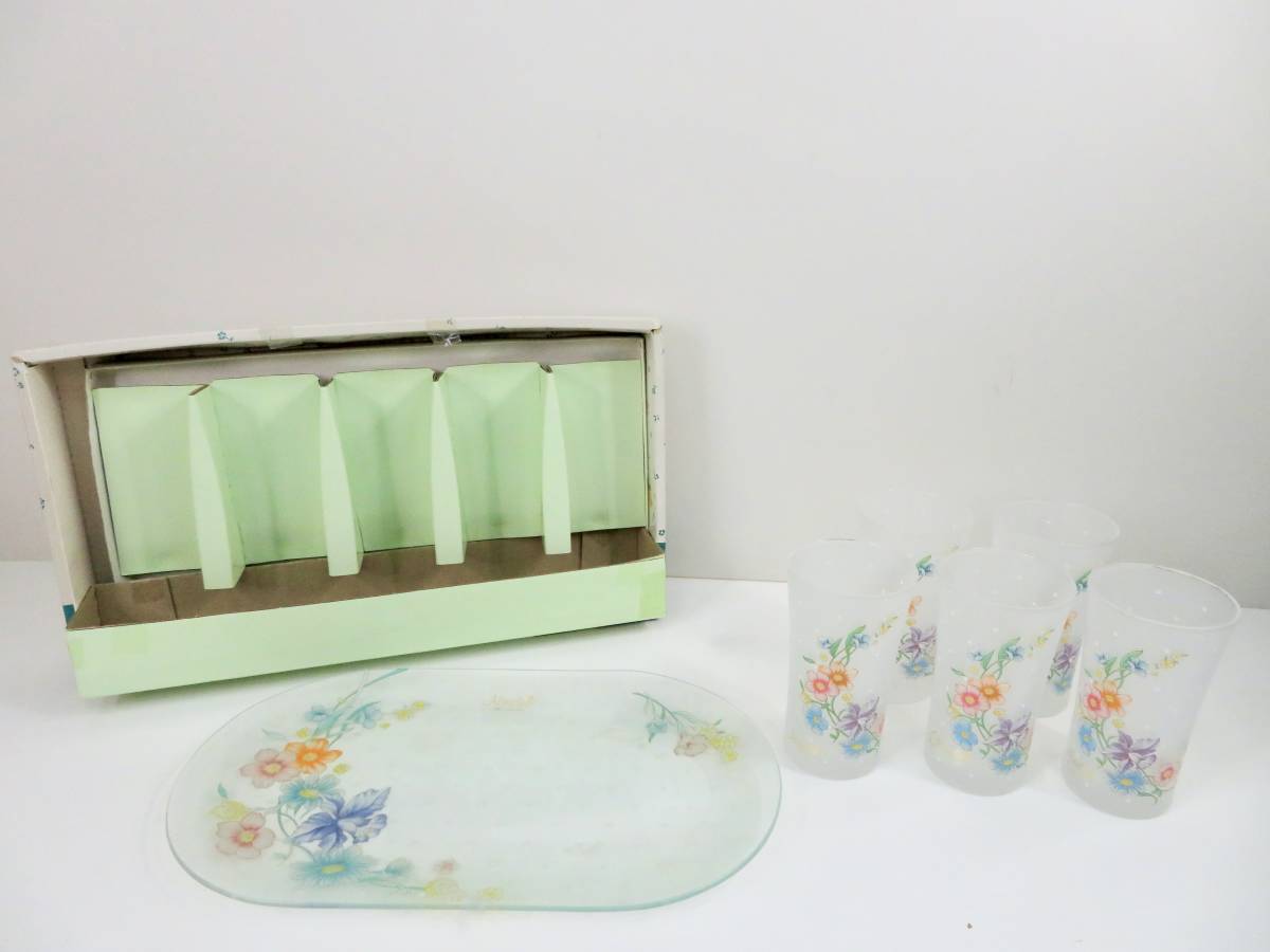 > ▲KAMEIGLASS カメイグラス Almelia グラス&プレートセット コップ5客 お皿1枚 花 箱あり 未使用品 管理2012 B-7