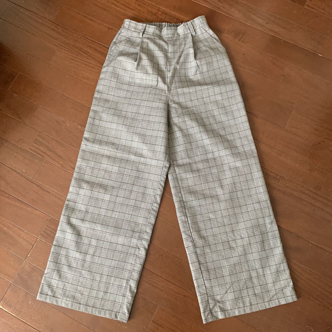 > チェックパンツ レディース M チェックワイドパンツ グレー 裏地有り グレンチェック ワイド ポリエステル 幅広 おしゃれ 秋 薄手 ゴム入り