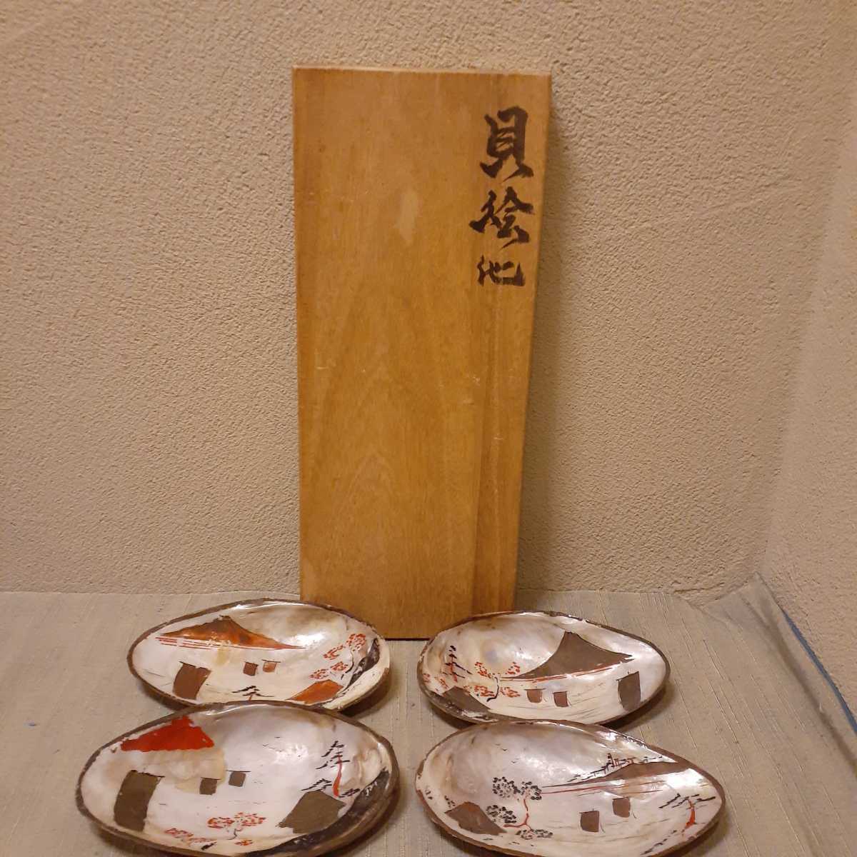 - 時代 貝合わせ ? 貝絵 4枚 (一番大きい貝)約13cm.7×11cm×2.5cm