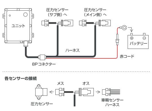 圧力センサーへは配線トラブルのない独自の専用防水コネクターによるカプラーオン装着です。