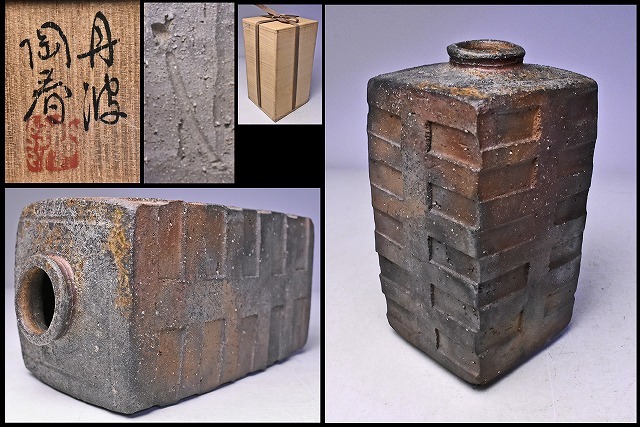 > 石田陶春 ★ 丹波 焼〆 算木型 花入 ★ 共箱 ★ 力強い造形が素晴らしい上作 ★ 師: 森本陶谷 ★ 華道具 ★