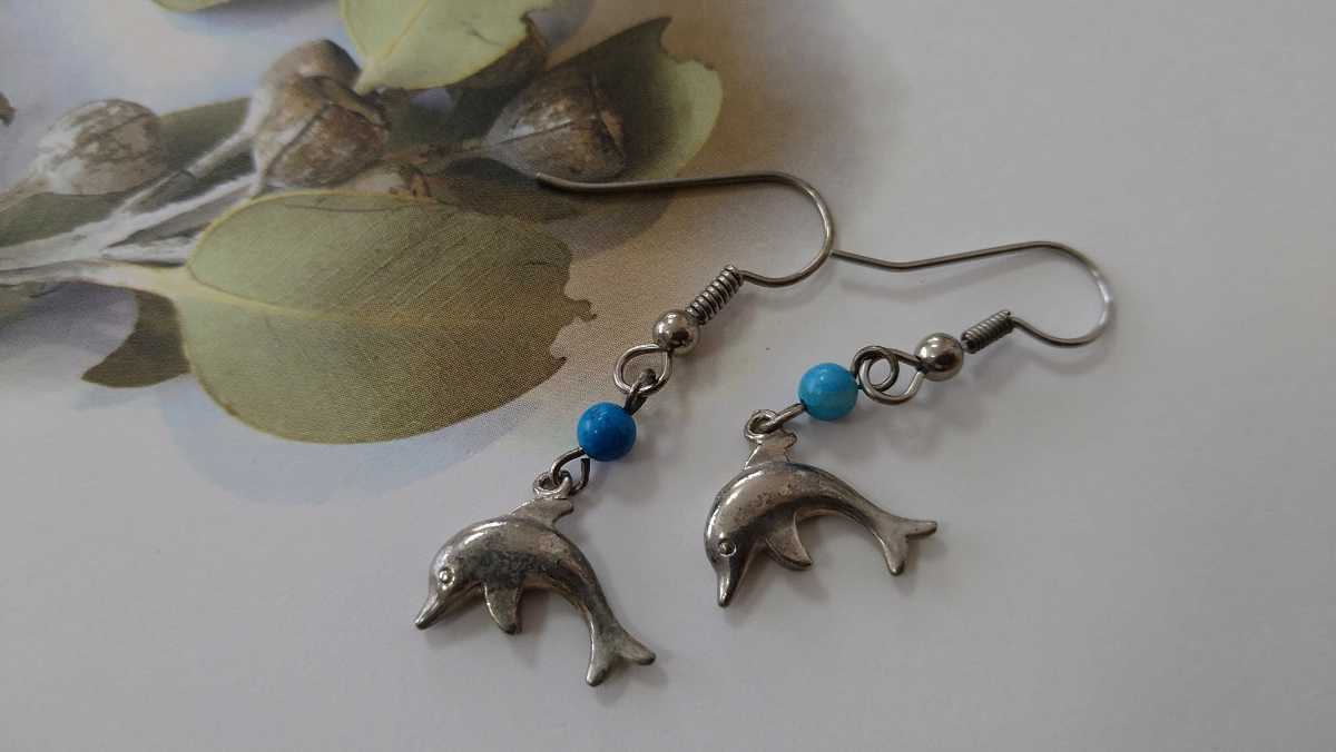 - □シルバーカラー・イルカ×水色ビーズ・ピアス□