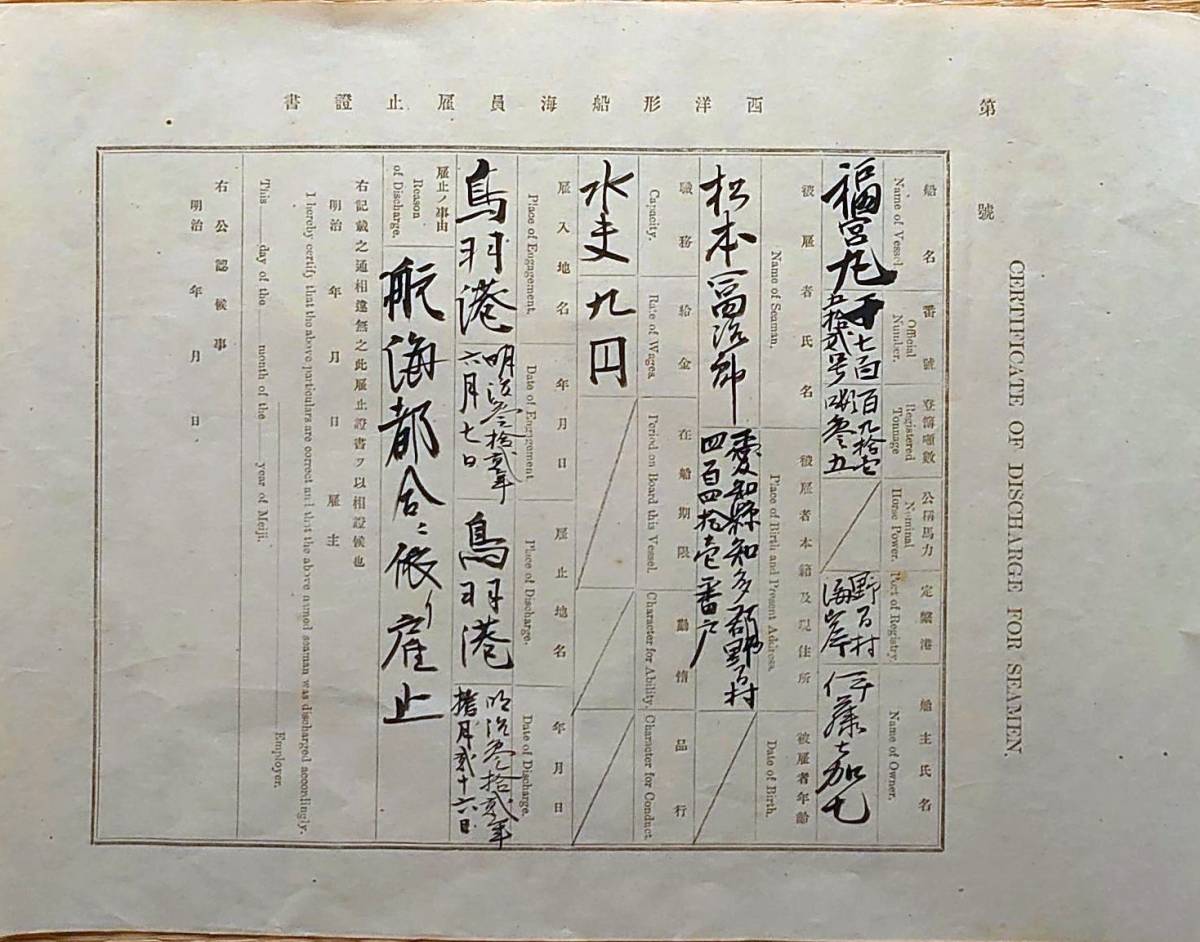 - f21070204〇西洋形船海員雇止證書 鳥羽港 愛知県 明治32年〇和本 古書 古文書