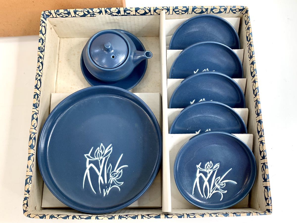 - 極美品▼漬け物盛り皿セット 醤油差し 中鉢 小皿 5枚セット和食器 食器 すみれ柄 青 箱付き 管理2107 Q-12